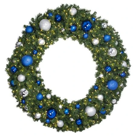 72″ Decorated Deluxe Oregon Fir Wreath – Lit with Warm White LEDs – Blue and Silver Décor